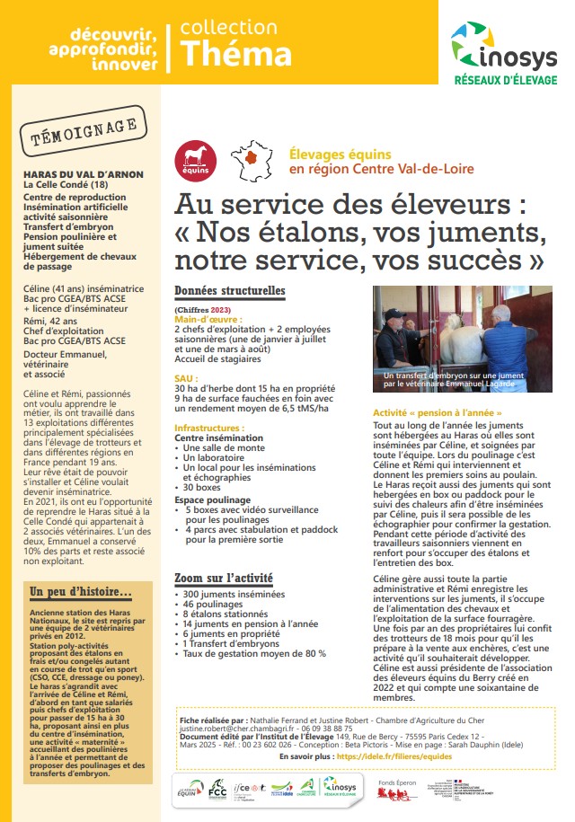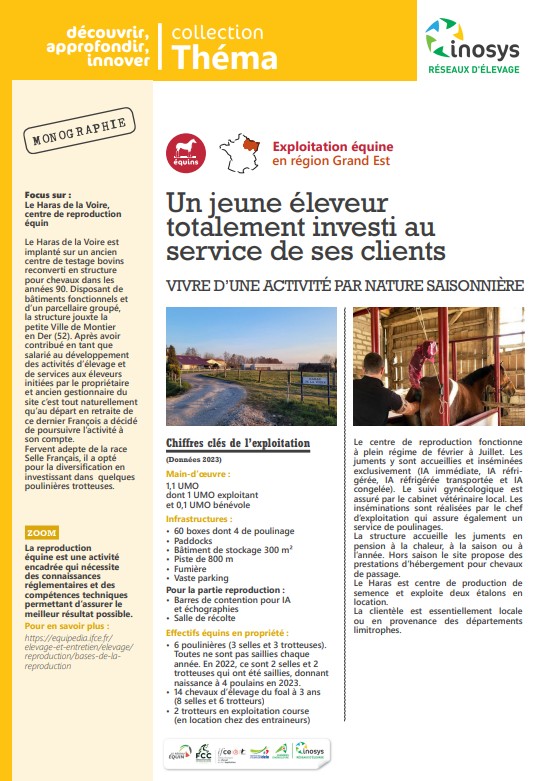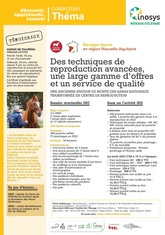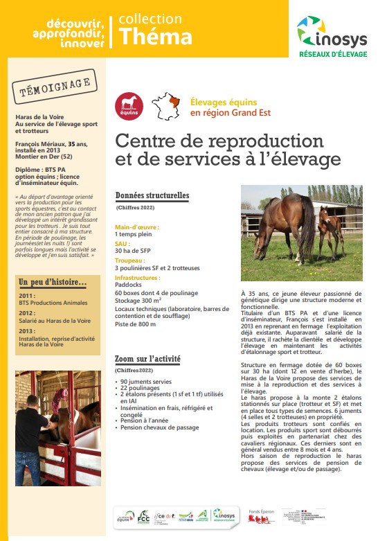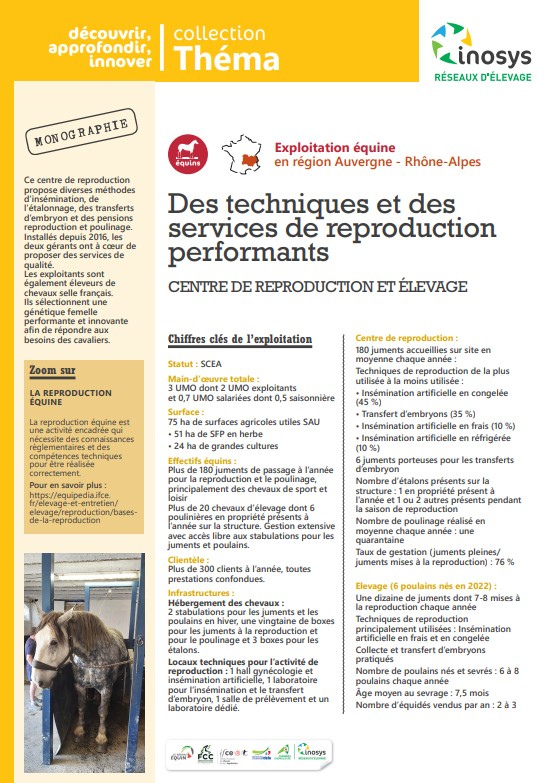 Le Réseau Equin s'est penché sur le fonctionnement des exploitations ayant mis en place un centre de reproduction : types de monte et prestations diversifiées de l'ICSI au poulinage ... Vous retrouverez l'ensemble des documents sur ce thème en téléchargement en cliquant sur les images concernées ci-dessous :