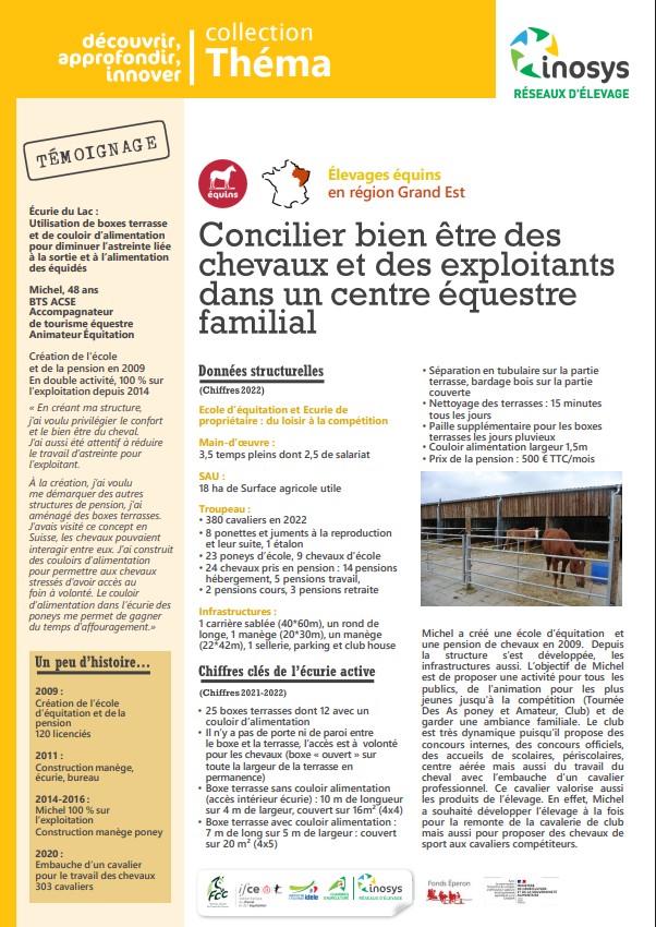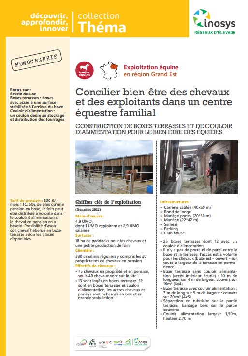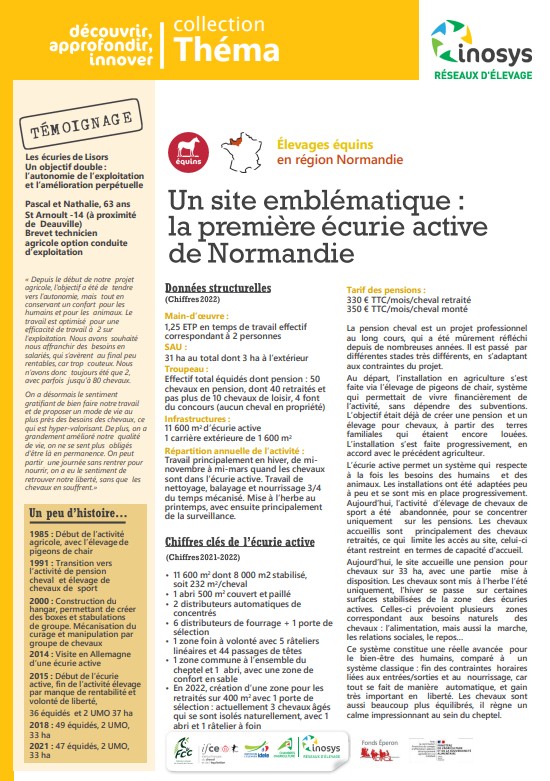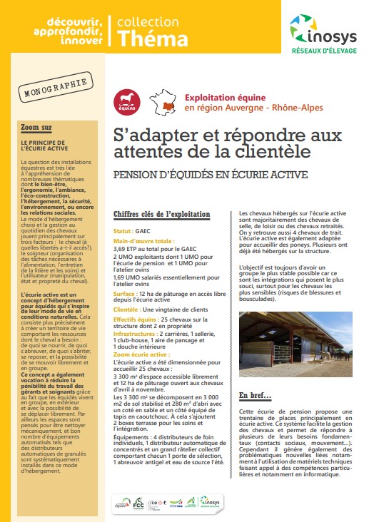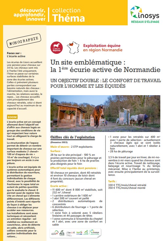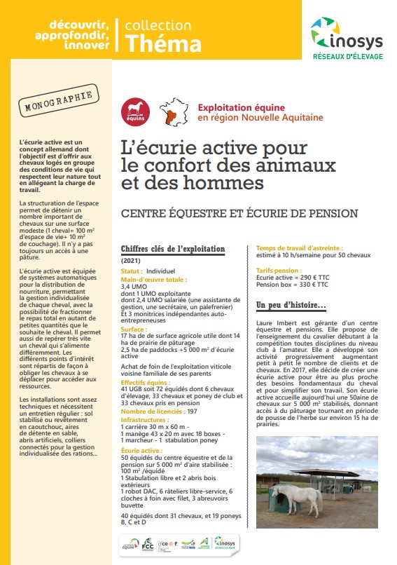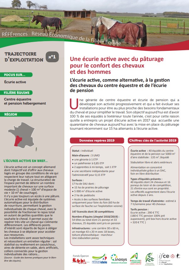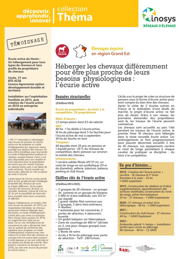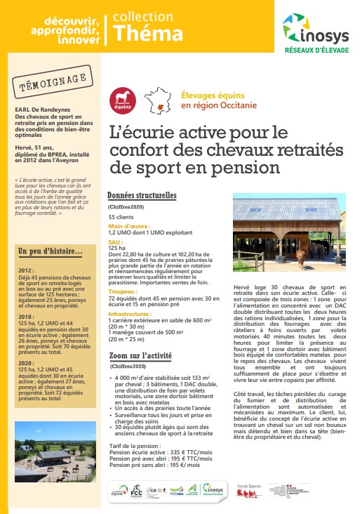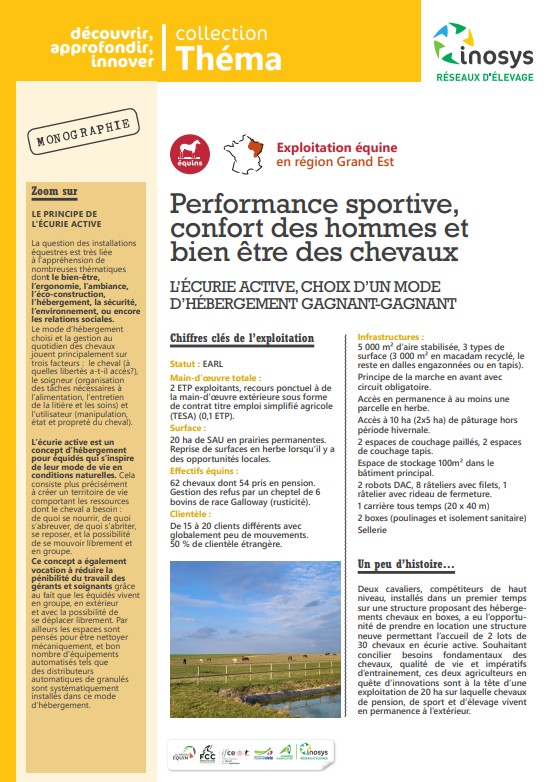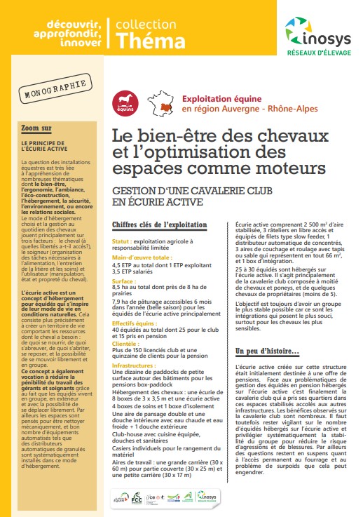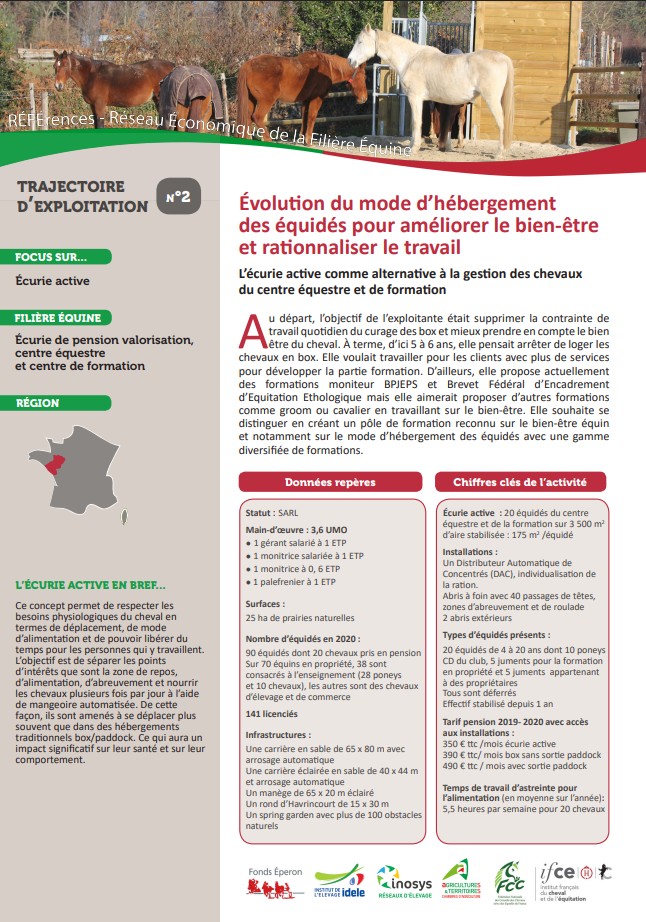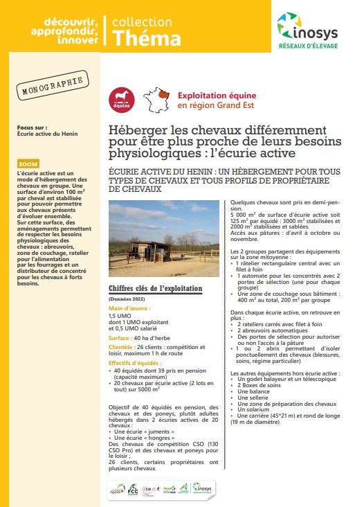 Le Réseau Equin s'est penché sur le fonctionnement des exploitations ayant fait le choix d'un mode d’hébergement innovant : optimisation de la surface et des infrastructures, écurie active, locations, ... Vous retrouverez l'ensemble des documents sur ce thème en téléchargement en cliquant sur les images concernées ci-dessous :