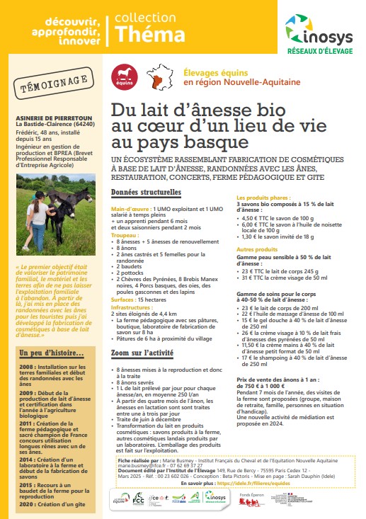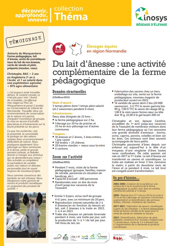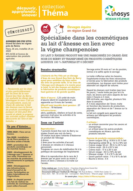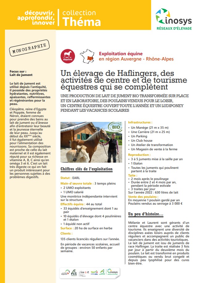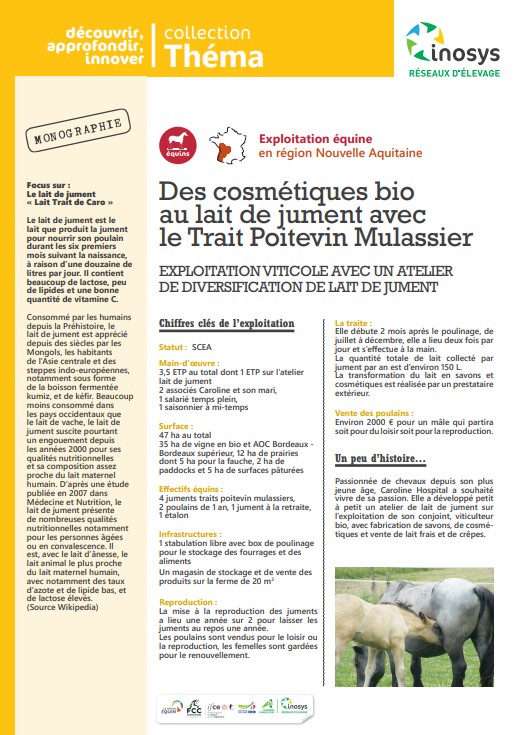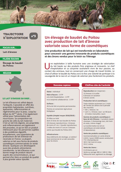 Le Réseau Equin s'est penché sur le fonctionnement des exploitations ayant développé un atelier lait de jument et/ou ânesse : cosmétiques, alimentation, atelier principal ou source de diversification ... Vous retrouverez l'ensemble des documents sur ce thème en téléchargement en cliquant sur les images concernées ci-dessous :
