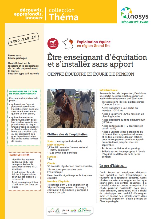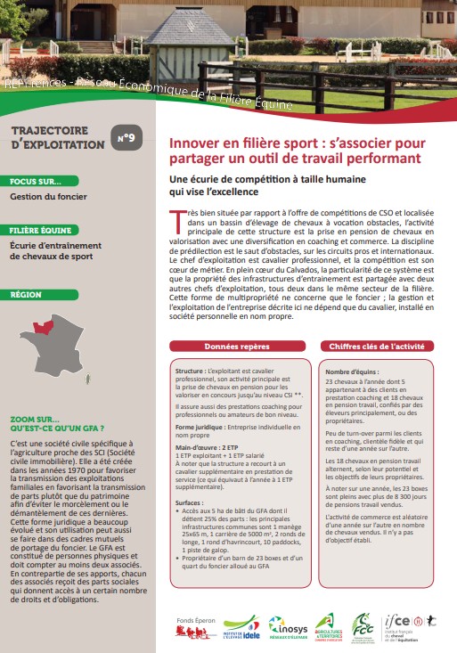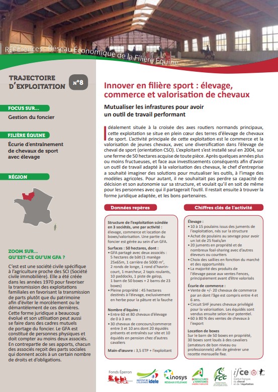 Le Réseau Equin s'est penché sur le fonctionnement des exploitations ayant mis en place une gestion du foncier atypique ou innovante : mutualisation du foncier et/ou des installations ... Vous retrouverez l'ensemble des documents sur ce thème en téléchargement en cliquant sur les images concernées ci-dessous :